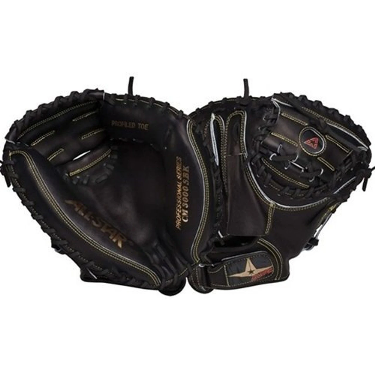 Allstar Catchers Mitt CM3000SBK Pro 33.5 inch Right Handed Throw. Allstar black CM3000 Catchers Mitt. Exclusive Japanese tanned steer hide. Individually hand made, each glove is a work of art. Soft tan leather pocket allows for great feel, fast break in, and gives the ball that extra pop that pitchers like. Black leather back gives the mitt just the right amount of support for handling the ball and lasting durability. Adjustable locking tab back eliminates bulk and improves comfort 33 1/2 inch.