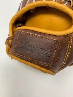 This classic 11.25 inch baseball glove is made with tan stiff American Kip leather, grey split welt, and anchor laces. One piece web, open back, light weight, and stiff leather make this glove great for infield or just playing catch.