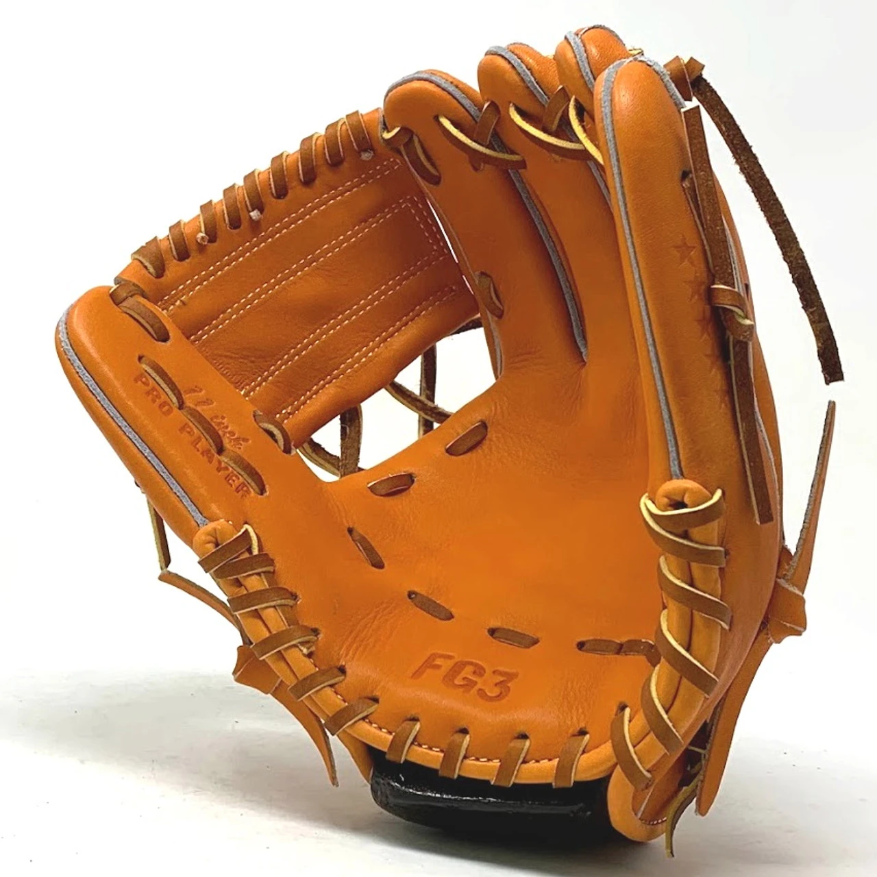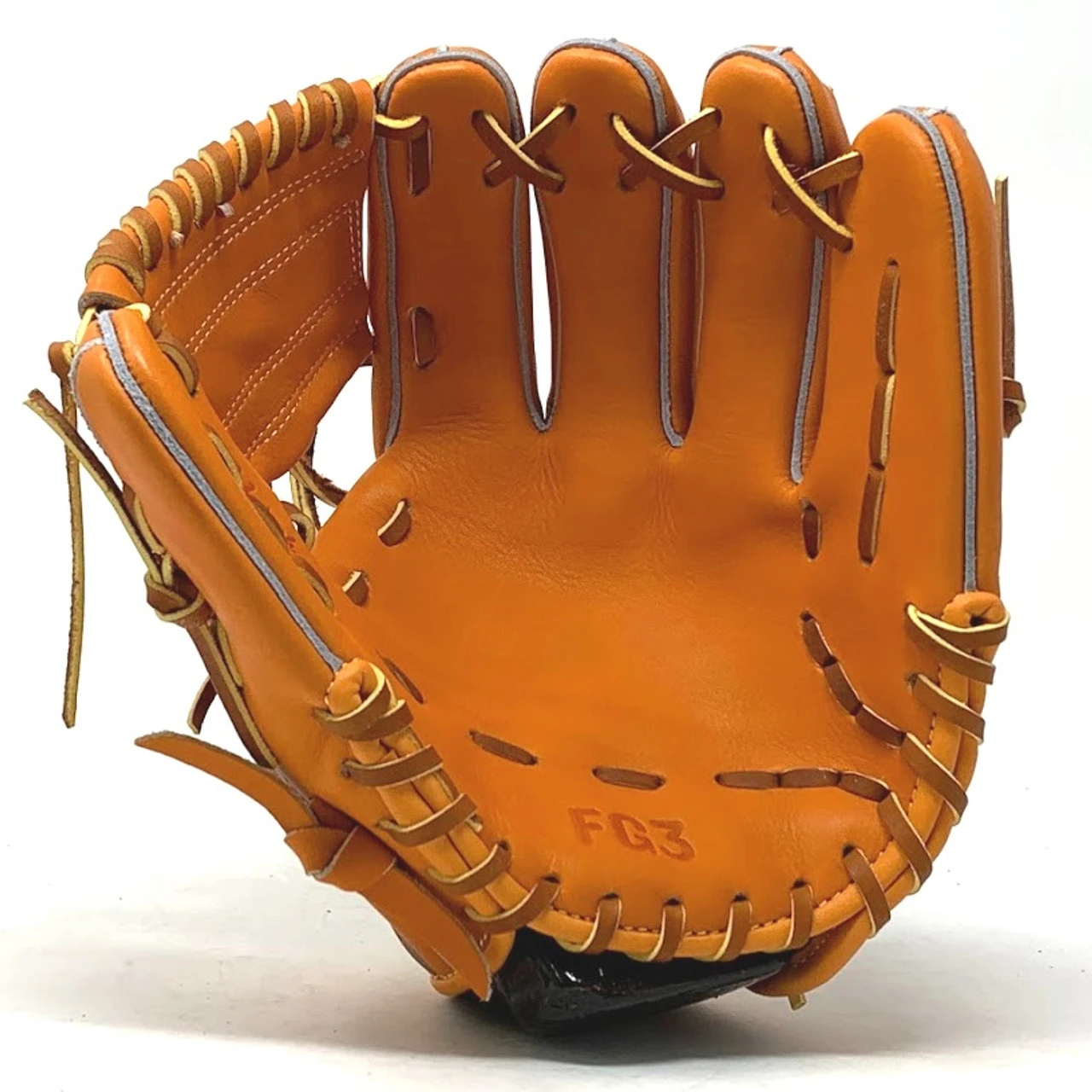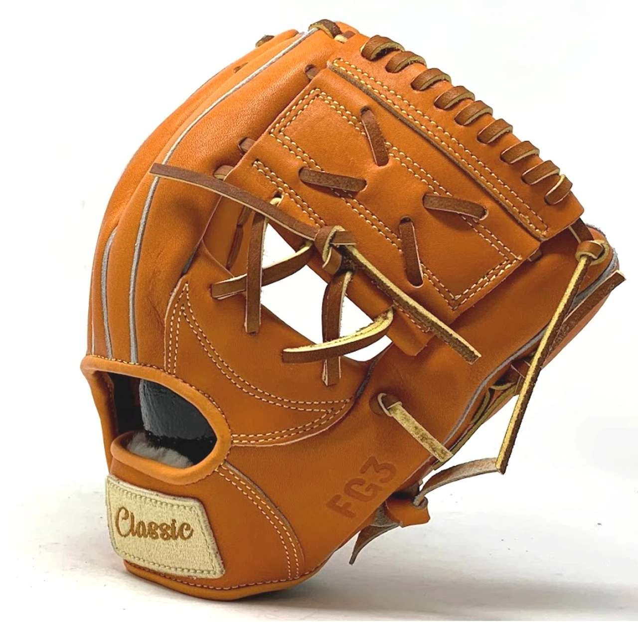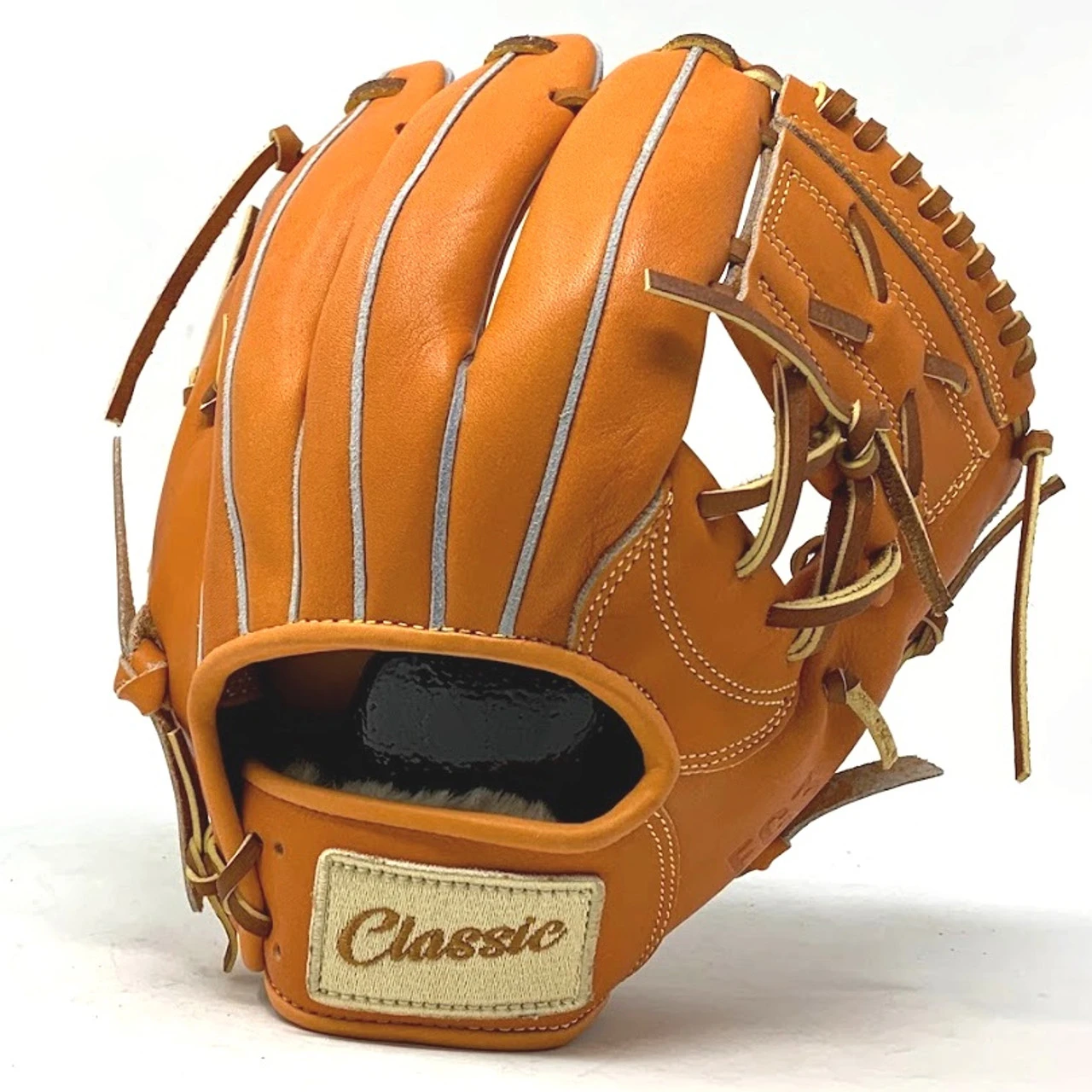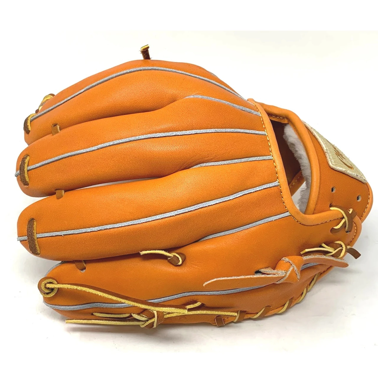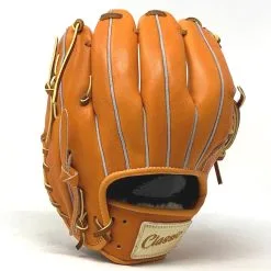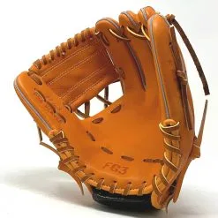 This classic 11 inch baseball glove is made with orange stiff American Kip leather. with rough welt. One piece web, open back, light weight, and stiff leather make this glove great for infield or just playing catch.