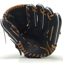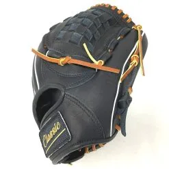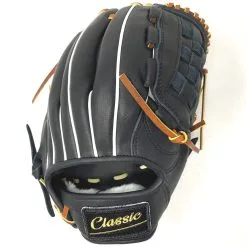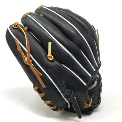 This classic pitcher or utility 12 inch baseball glove is made with black stiff American Kip leather with brown laces. Basket web for strength and closed web with open back, light weight, and stiff leather make this glove great for pitching, any position, or just playing catch.