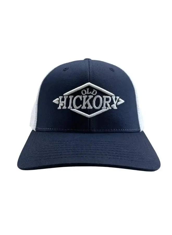 Stylish headwear from Old Hickory. These caps feature a navy bill and front panel with the Old Hickory logo embroidered on the front and white mesh FlexFit back. Available in a mid-pro crown flex fit design (available in S/M and L/XL).