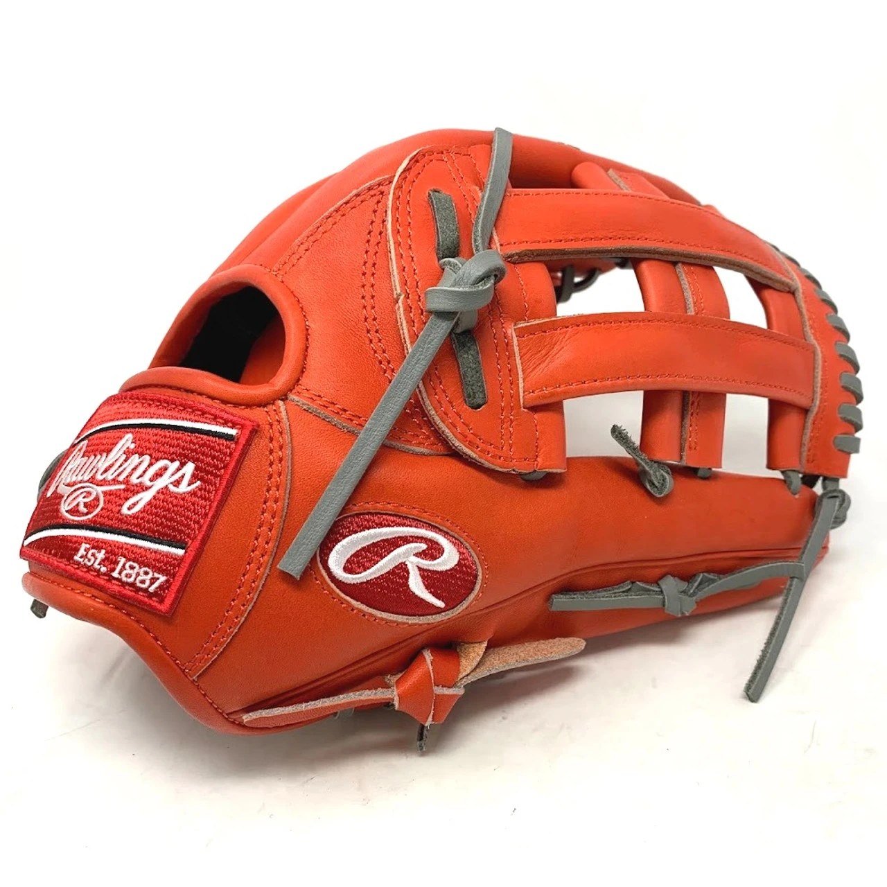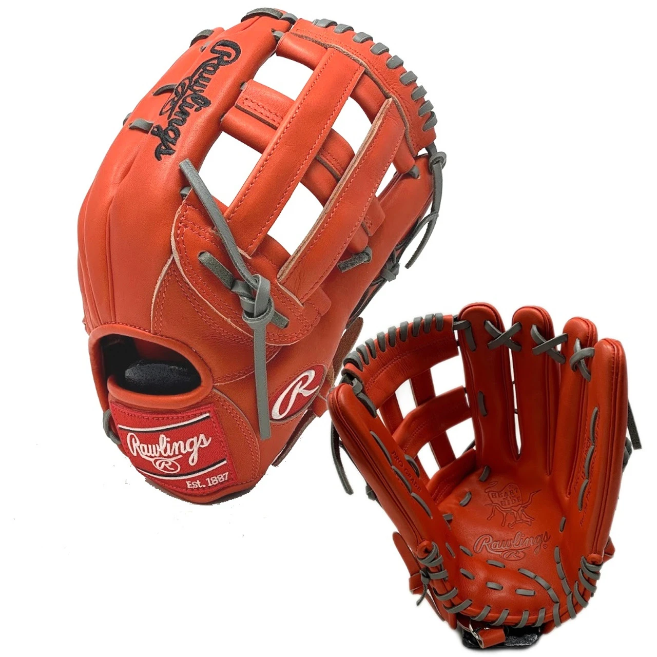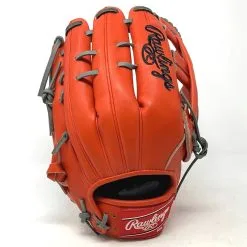 Ballgloves.com Exclusive in Rawlings Heart of the Hide Red-Orange leather. 42 pattern, 12.75 inch, grey lace.