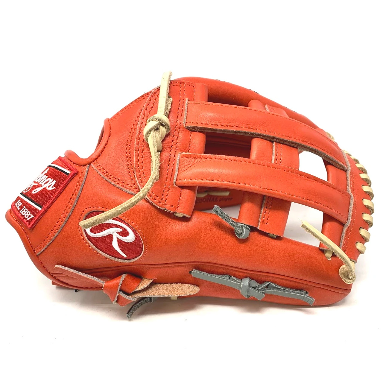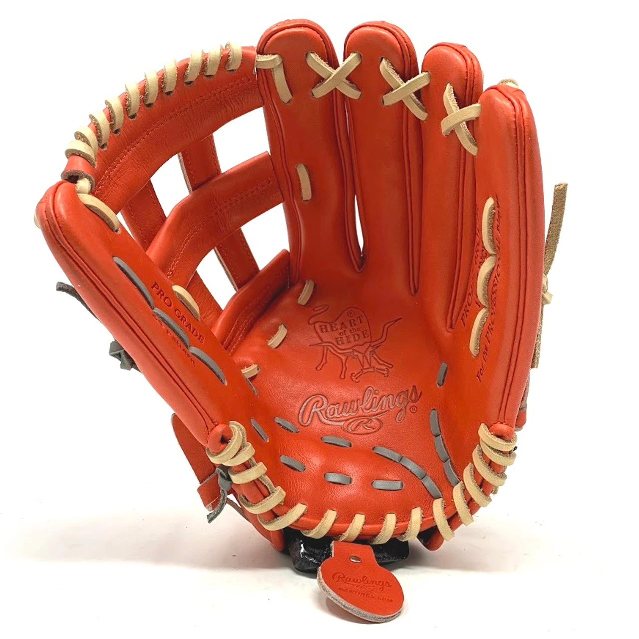 Ballgloves.com Exclusive in Rawlings Heart of the Hide Red-Orange leather. 42 pattern, 12.75 inch, camel lace.