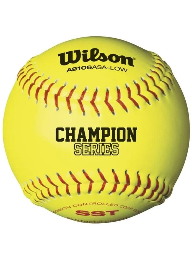 Dura-Lon Optic yellow synthetic leather. 0.47 max COR cork center. ASA Stamp. 375 lbs. Compresion. 11 inch yellow softball.